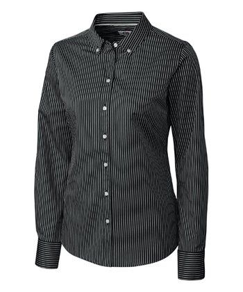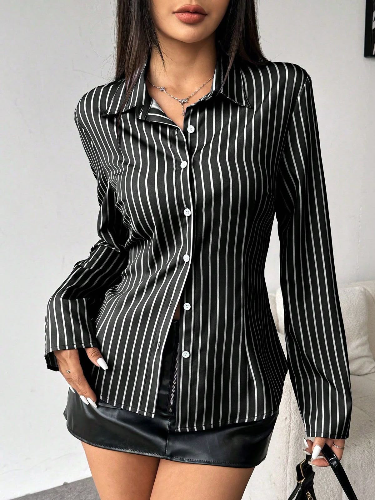 Atasan kemeja lengan panjang warna hitam dengan garis-garis warna putih berbahan katun dan polyster.