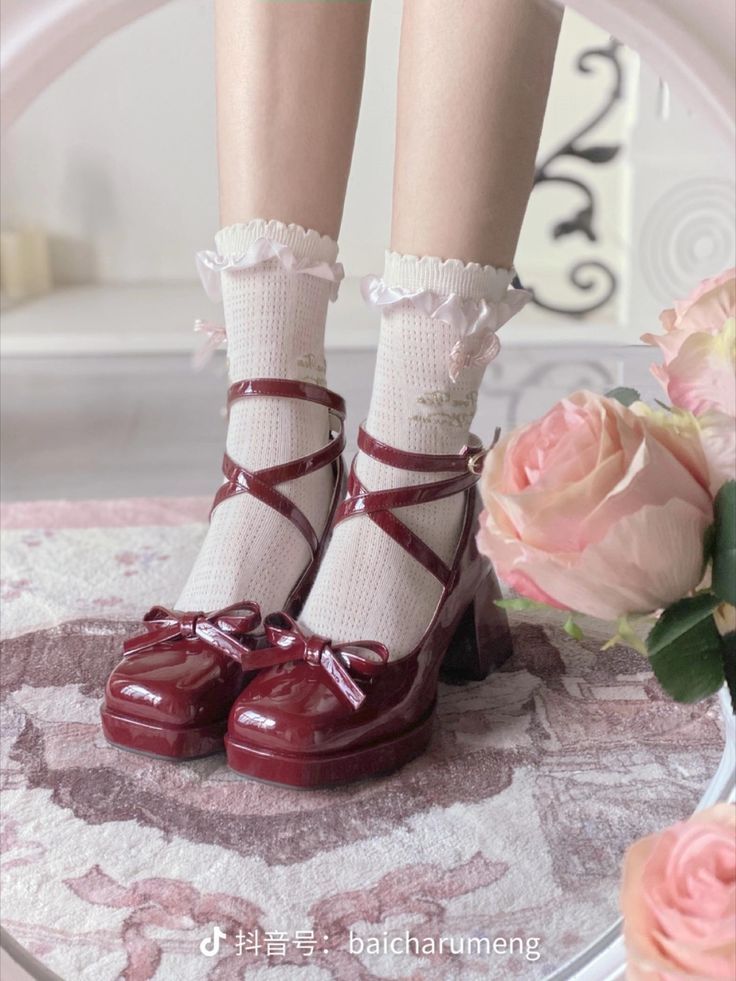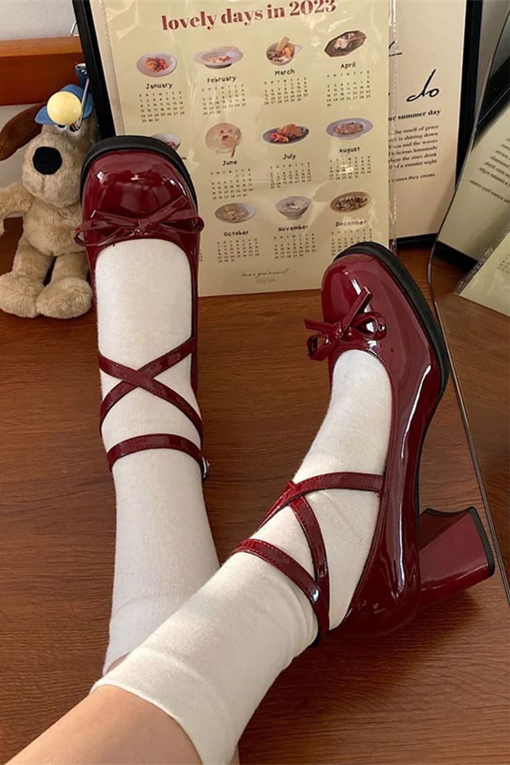 Sepatu hak tinggi berwana merah dengan hiasan pita berbahan kulit paten.