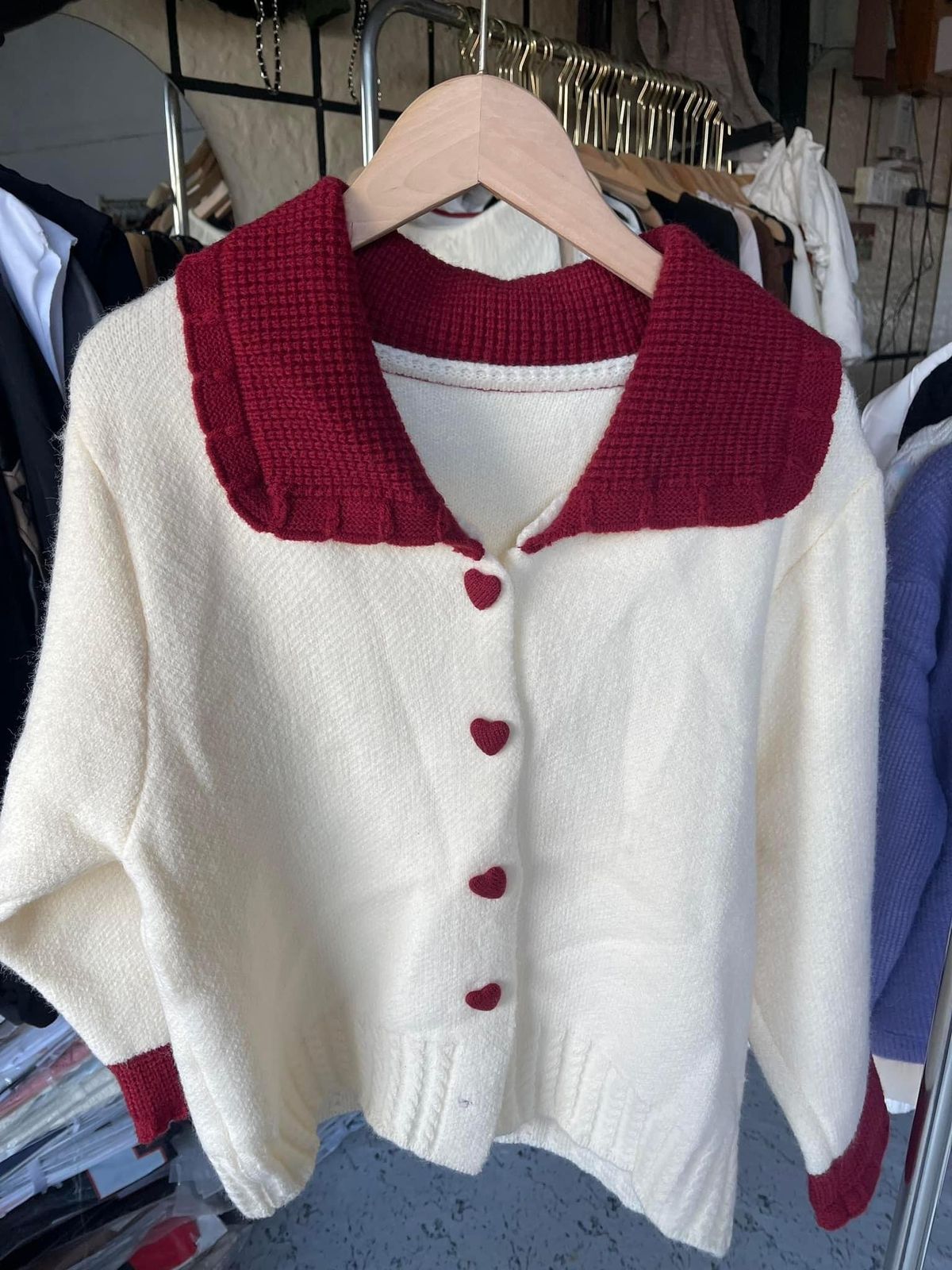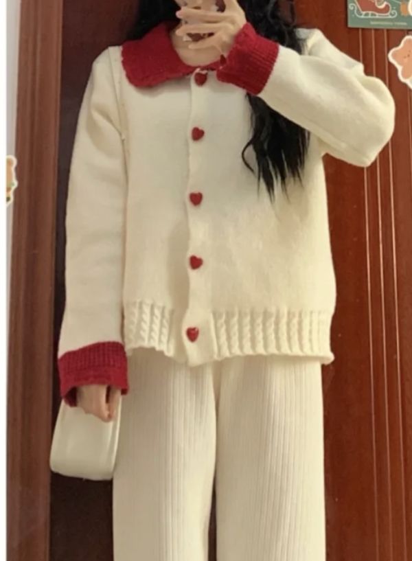 Atasan rajut berwarna putih lengan panjang dengan kerah merah berbahan wol dan katun.